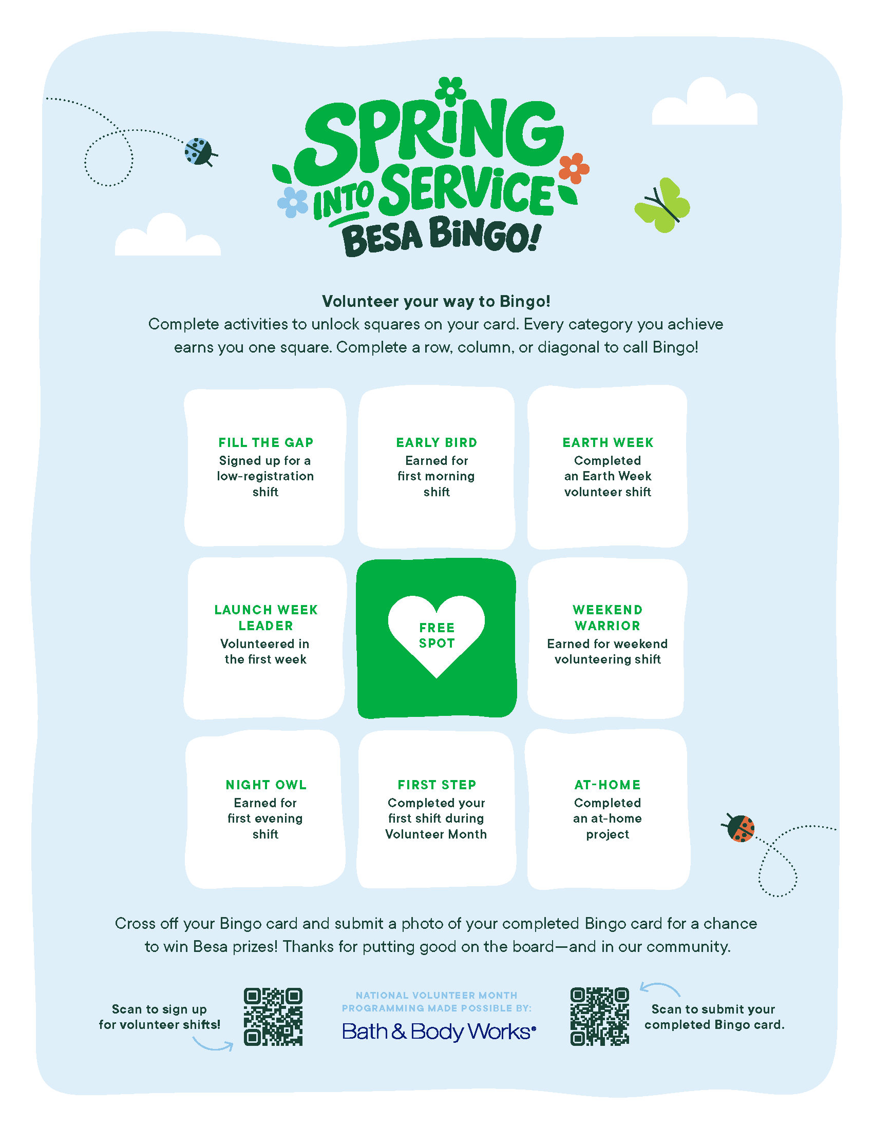 Join a volunteer shift or play along with our Spring into Service Besa Bingo challenge. Create a free account in two minutes to unlock volunteer opportunities, find what fits your schedule, and start doing good.